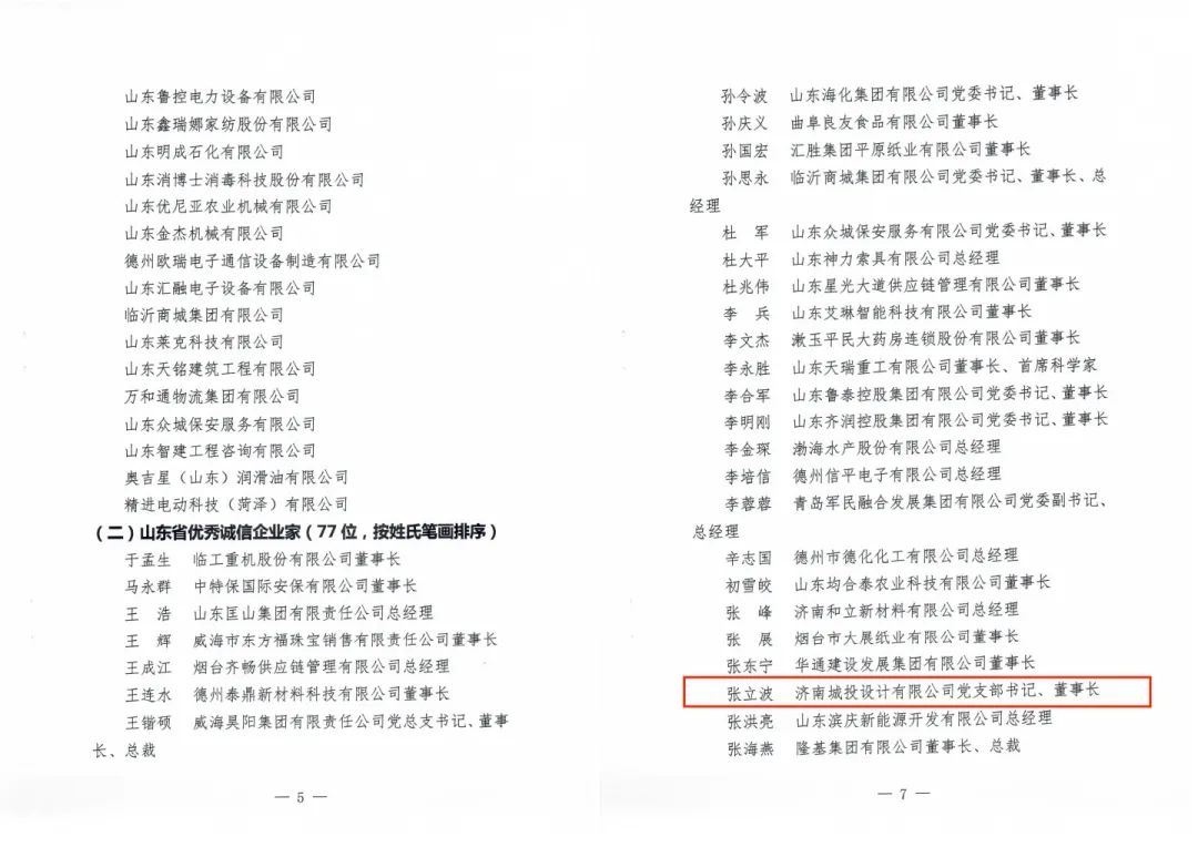 會議表彰了全省87家誠信企業(yè)、77名優(yōu)秀誠信企業(yè)家、25家誠信建設示范企業(yè)和15名誠信建設示范企業(yè)領軍人物。其中,濟南城投設計有限公司被授予“山東省誠信企業(yè)”榮譽稱號,公司黨支部書記、董事長張立波被授予“山東省優(yōu)秀誠信企業(yè)家”榮譽稱號。