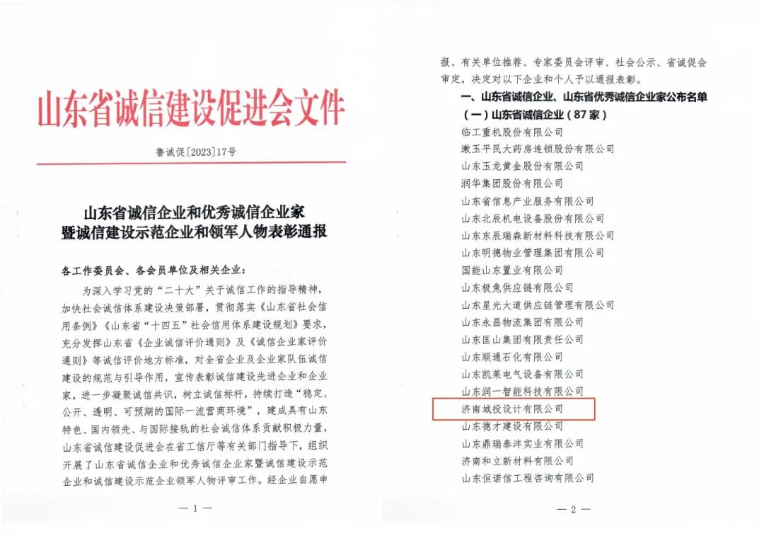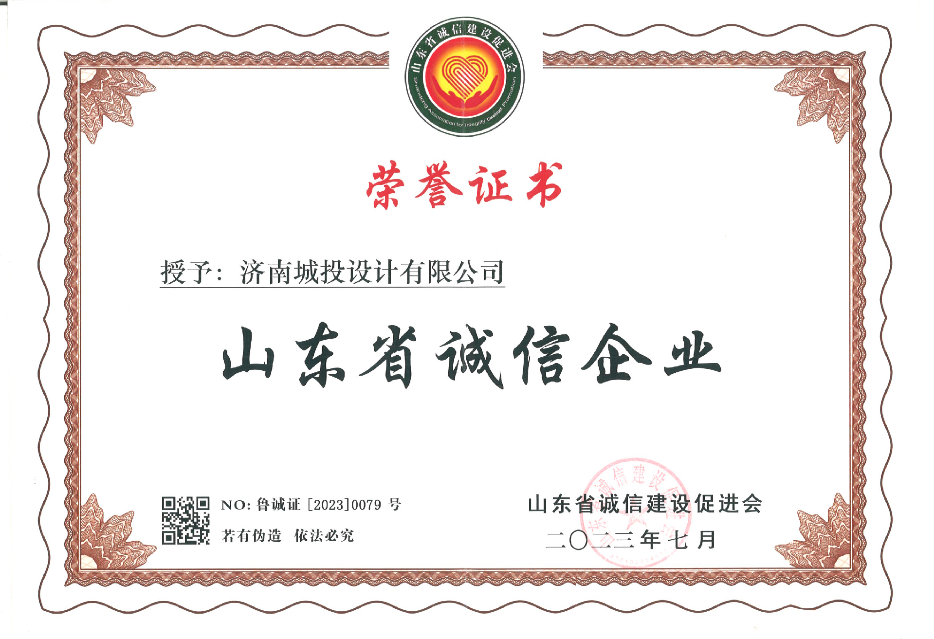 多年來,濟南城投設計有限公司以“為生態(tài)更文明,讓生活更美好”為企業(yè)使命,積極踐行“知行合一,為人民服務”的企業(yè)核心價值觀……將誠信品質深深融入到公司的企業(yè)文化和生產(chǎn)經(jīng)營中,塑造了良好的企業(yè)形象,樹立了良好的社會聲譽。